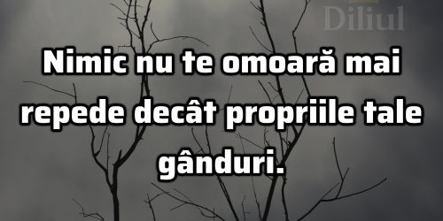 Home > Citate 📜 Gândurile rele ne iau din viață, bucuriile ne dau viață. Gândurile rele ne iau din viață, bucuriile ne dau viață. Vizitatori: 264 Categories:Citate 📜 Diliul Facebook Instagram PayPal Contact Form Share Share on Facebook Related Posts Citate 📜 Nu mai încerca să fii plăcut de toată lumea, nici măcar ție nu-ți place toată lumea. Citate 📜 Nimic nu te omoară mai repede decât propriile tale gânduri. Citate 📜 Persoana potrivită te va face să vezi că tu nu ai fost niciodată problema. Ci doar te-ai oferit cui nu te merita. Lasă un răspunsAdresa ta de email nu va fi publicată. Câmpurile obligatorii sunt marcate cu *Comentariu * Nume * Email * Site web Post comment Post anterior „Când urci în trenul greșit, încearcă să cobori la prima stație. Fiindcă cu cât mergi mai mult, cu atât costă mai mult să te întorci.” Post urmator Felul în care o persoană reacționează atunci când nu ești bine, spune multe despre cât de mult ține la tine.