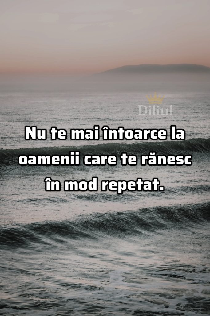 Home > Citate 📜 Nu te mai întoarce la oamenii care te rănesc în mod repetat. Vizitatori: 9 Categories:Citate 📜 Diliul Facebook Instagram PayPal Contact Form Share Share on Facebook Related Posts Citate 📜 Ești norocos atunci când ai atenția cuiva care ignoră pe toată lumea. Citate 📜 Oamenii cu suflet bun chiar există. Păcat că în loc să fie apreciați, sunt călcați în picioare. Citate 📜 Adevărul are un obicei prost: Deranjează. Lasă un răspunsAdresa ta de email nu va fi publicată. Câmpurile obligatorii sunt marcate cu *Comentariu * Nume * Email * Site web Post comment Post anterior Tot ce am este datorită lui Dumnezeu. Post urmator Viața nu înseamnă avere, bani sau putere, viața înseamnă sănătate, când o ai le faci pe toate.